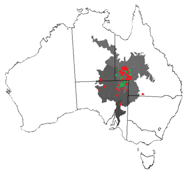 Kowari distribution (Adapted from Woinarski et al. 2012). Grey = bioregions that kowaris exist in. Red = places they’ve disappeared from (not recorded since before 1993). Green = records since 1993.
