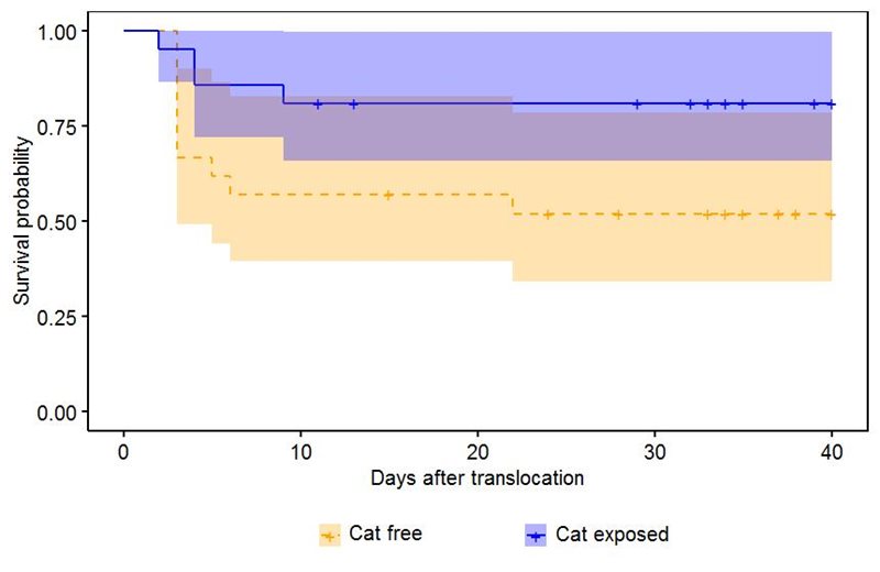 Cat-exposed bilbies had a greater survival probability than cat-free bilbies over 40 days. (p = 0.042, with 95% confidence intervals).