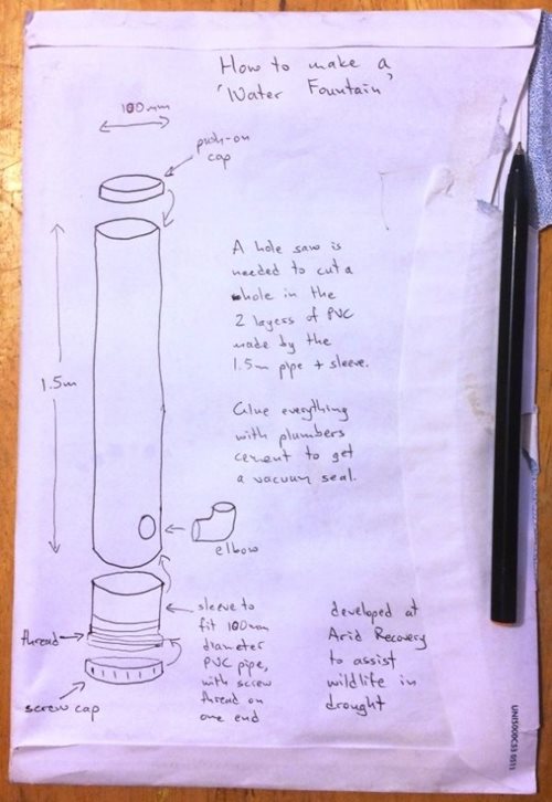 To give drought relief to animals at the Arid Recovery Reserve we have been making and putting out ‘water fountains’.