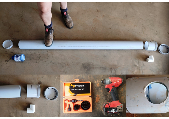Start with a length of 100 mm diameter PVC pipe. We had them cut into 1.5 m lengths. Use plumbers cement to glue a push-on cap at one end. Fit a threaded sleeve (to suit 100 mm pipe) to the other end and glue it on too. Let that dry, then use a hole saw to cut a 60 mm diameter circular hole at the base, cutting through the now double layer of PVC where the sleeve has been glued on. Take a screw cap to fit the threaded sleeve and glue that on too. Finish by gluing a 60 mm diameter elbow fitting into the hole.