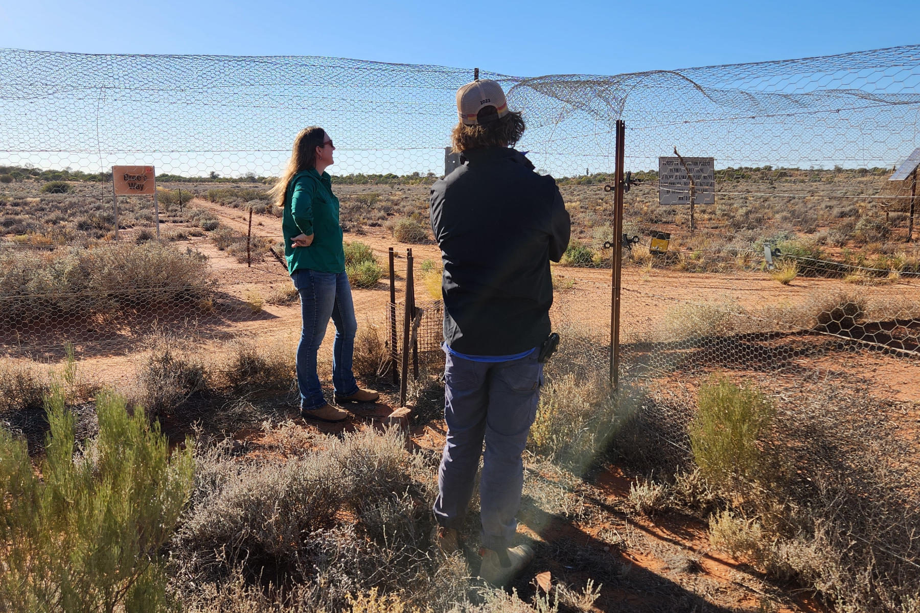 Manager of Arid Recovery, Kath Tuft and Conservation Land Manager, Nathan Manders assessing the incursion area and discussing how they were outsmarted by a quoll