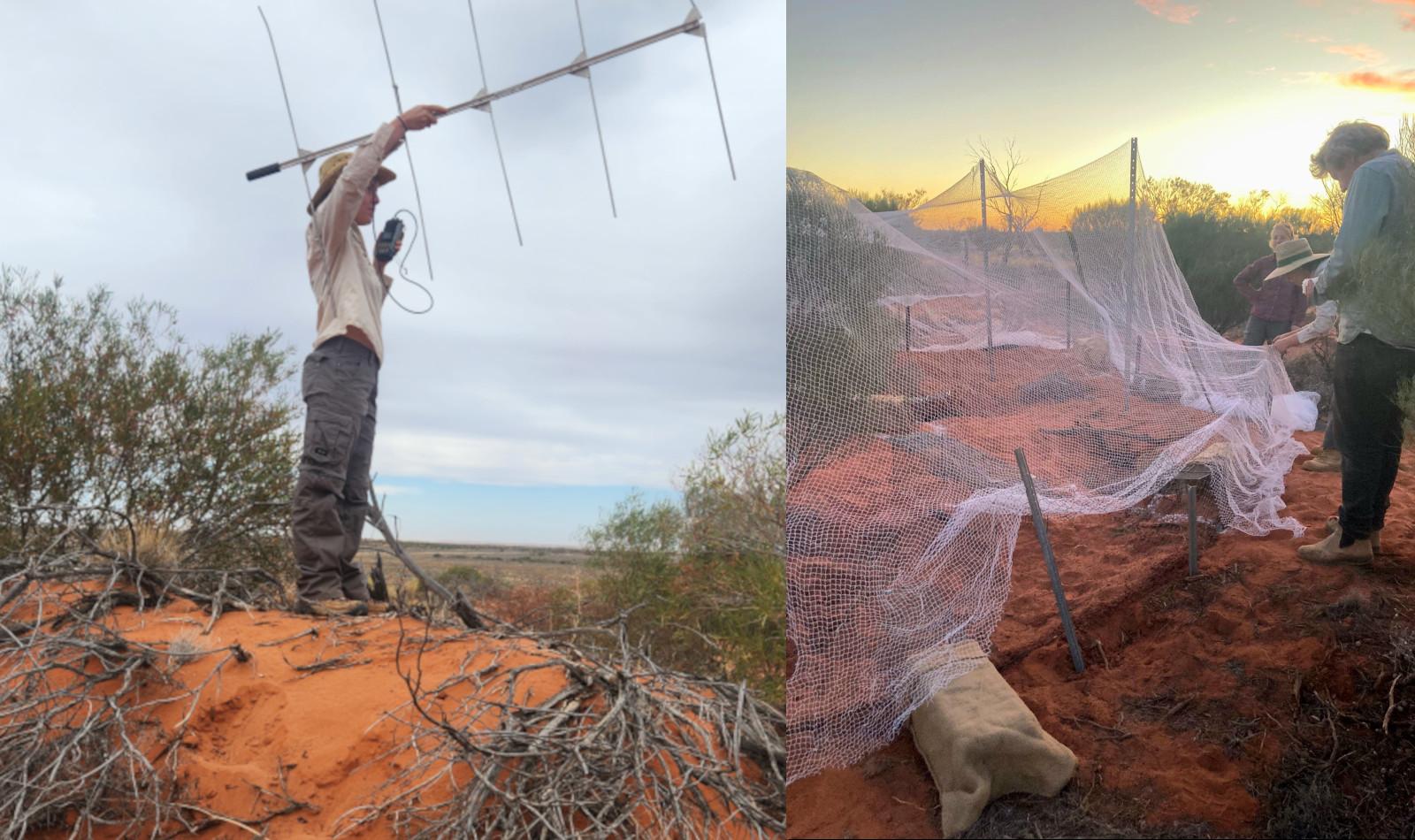 Intern Charlotte radio-tracking the quoll (left), and Arid Recovery staff building an elaborate trap to snare the quoll (right)The GPS data was crucial in pinpointing the quoll's entry point at an internal corner, enabling us to bolster our defenses of the control paddock. After its recapture, the quoll was relocated to the Flinders Ranges, joining other western quolls in a suitable habitat. This epic exercise highlighted the importance of adaptability in our ongoing efforts to maintain experimental integrity at Arid Recovery.