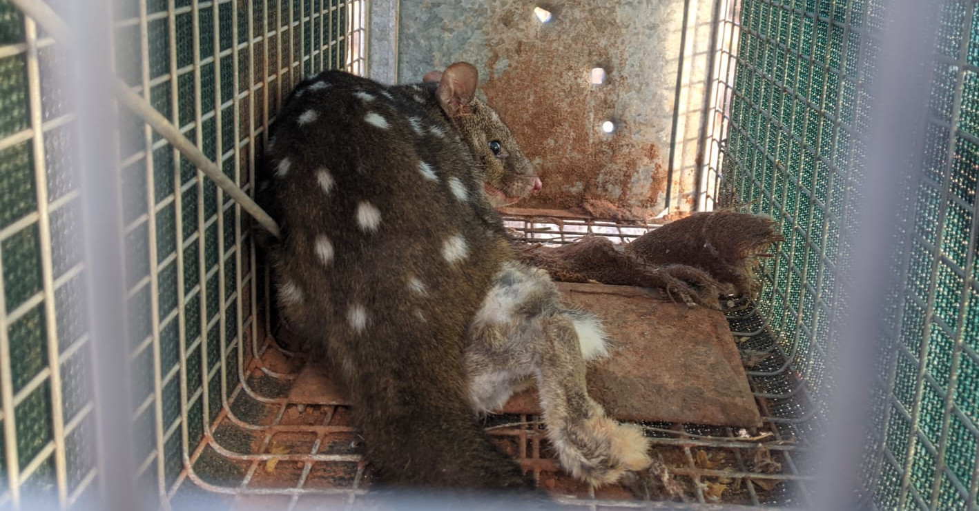 For several days, the quoll’s radio collar signal remained elusive. Finally, we picked up a signal from inside the Main Exclosure—the quoll had managed to sneak back in. We still didn't know how it got in and needed that GPS data to uncover the entry point. Demonstrating remarkable tenacity, the quoll eluded our trapping efforts twice. Undeterred, our team intensified their efforts, deploying a variety of traps, including net canopies, burrow traps, and cage traps. On the third attempt, persistence paid off, and we successfully recaptured the quoll.