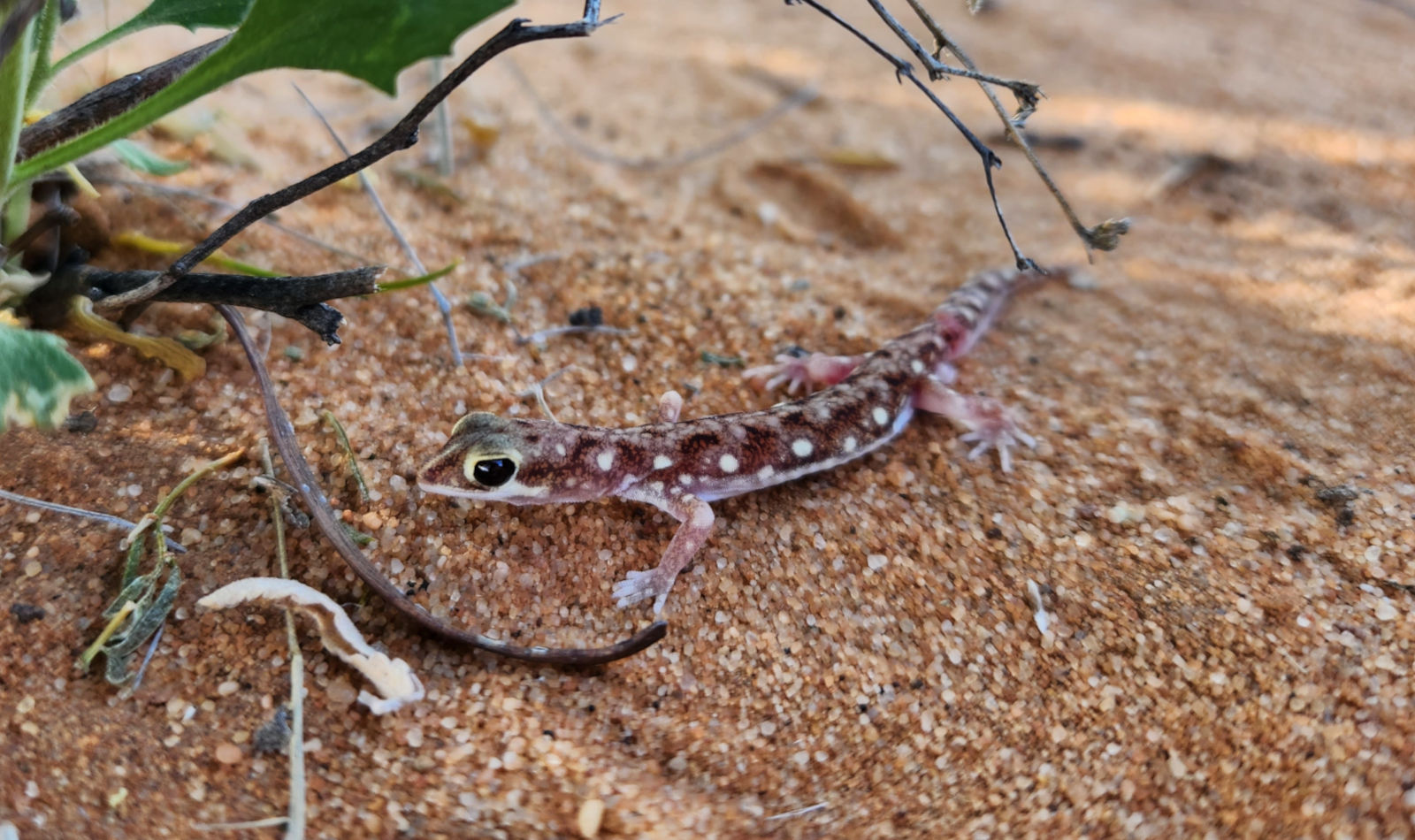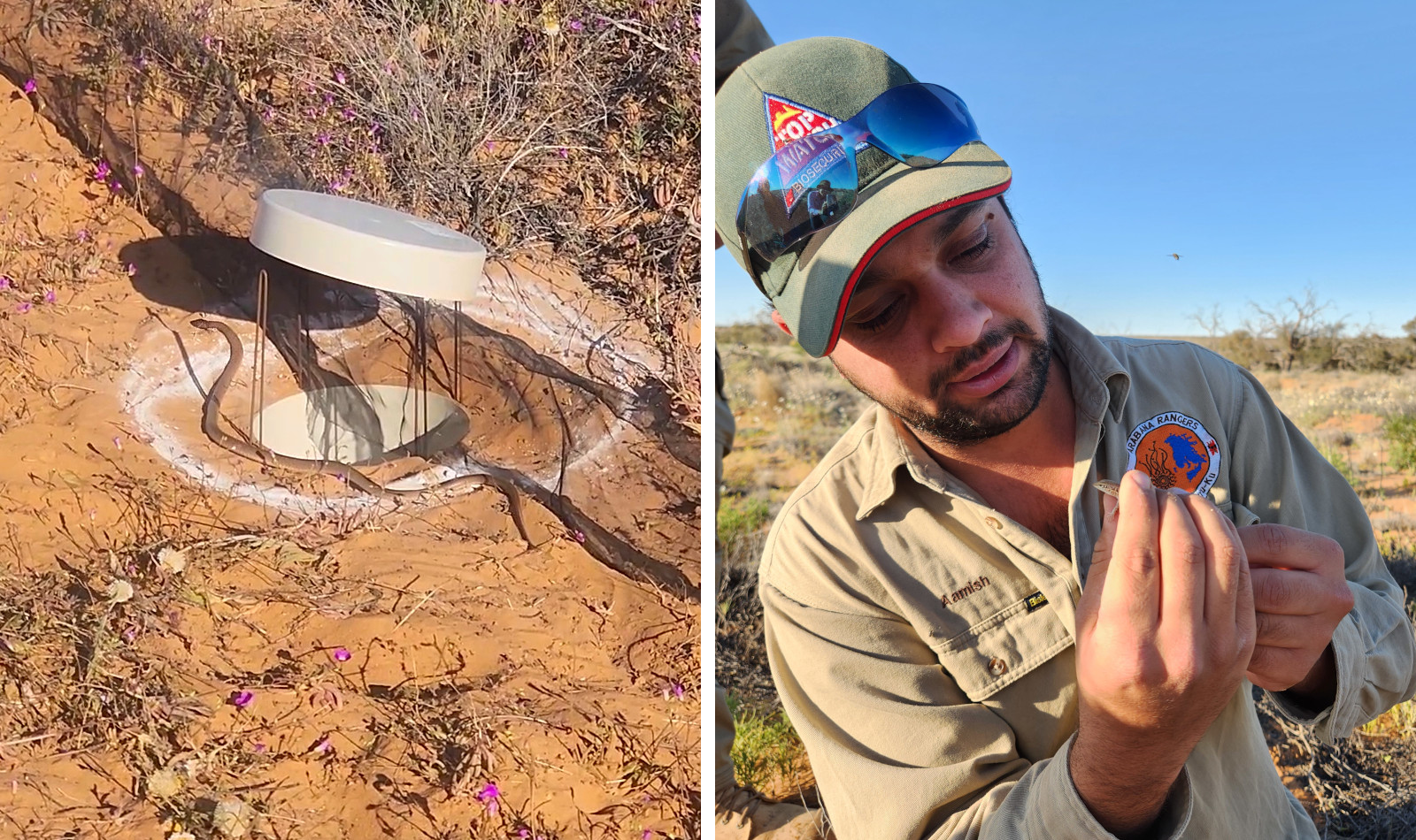Four years ago, we visited Finniss Springs to carry out a similar survey, and this time, we returned to learn and collaborate once again. The Arabana Rangers showed enthusiasm as they learnt the particulars of pitfall and Elliott trapping. Setting up pitfall traps involves digging buckets into the ground and setting up low mesh fences to guide animals toward the traps—similar to how a mouse might follow the edges of a room. While we were all proficient at digging and setting traps, the animals were less cooperative. In one amusing moment, we watched a curious brown snake slither along the mesh fence. With bated breath, we watched it approach the bucket, only for it to poke its head in and decide against it, retreating back into the bushes. Though the snake eluded us, we were lucky enough to trap a few skinks, geckos, and painted dragons, as well as spotting over 50 birds.