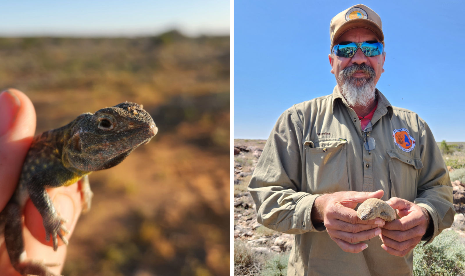 A painted dragon (Ctenophorus pictus), and Arabana Ranger Hayden with a gidgee skink (Egernia stokesii)One of the memorable parts of our trip was exploring a nearby rocky outcrop where we discovered fossils of leaves and the preserved footprints of kangaroos and emus. The rocks seemed perfect for gidgee skinks, and with a bit of investigating, we spotted their tell-tale signs—piles of gidgee skink poop neatly deposited in communal areas. After some patient searching, we finally found the elusive skinks basking among the rocks.
