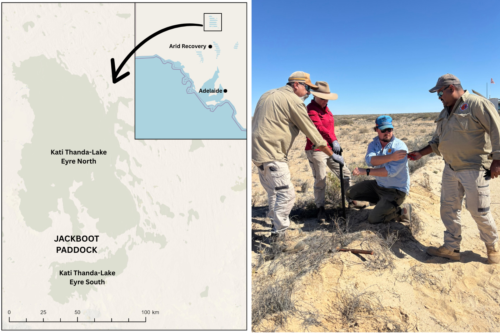 Jackboot Paddock is between Kati Thanda-Lake Eyre North and South (Map source: ESRI) (left), and Arid Recovery staff and Arabana Rangers setting up the first camera (right). To better understand these threats, the team deployed 50 motion-sensing camera-traps across Jackboot Paddock to monitor the activity and density of these invasive animals. These eyes on the landscape allow us to see what is happening when we are not there, gathering information on where and when feral animals are most active.