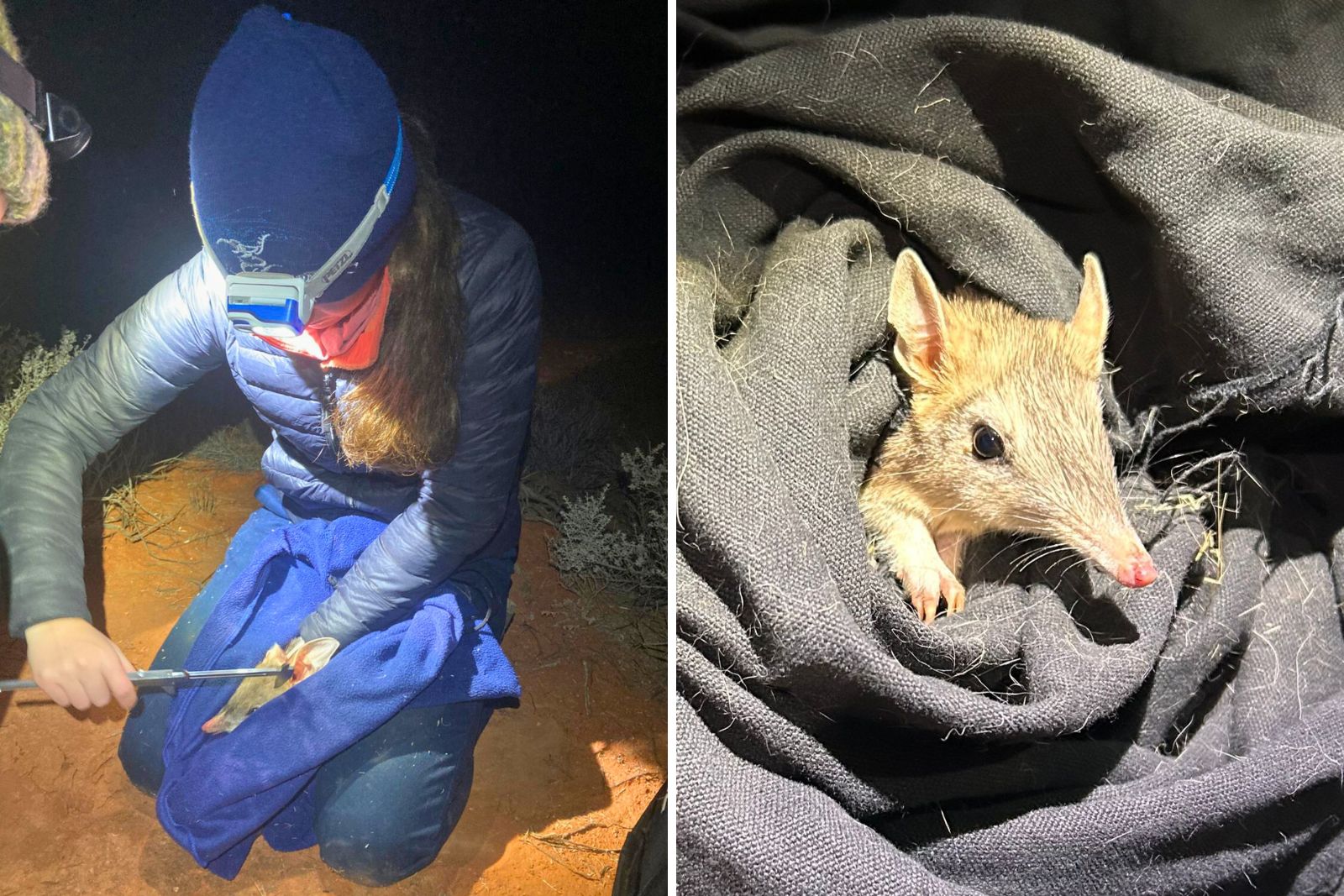 Rose measuring the head length of a bilby (left) and a Shark Bay bandicoot that doesn't want to leave the warmth of the bag (right) I learnt not only how to practically undertake mammal surveys, but the adaptability one needs to work in the field, the efficiency required to get through a trapping session combined with constant problem solving was a prowess I had to pick up quickly. I also saw how the team at Arid Recovery were able to work together seamlessly in the field and in the office. It meant the animals were trapped, processed, and released to a high standard of ethical care and consideration.