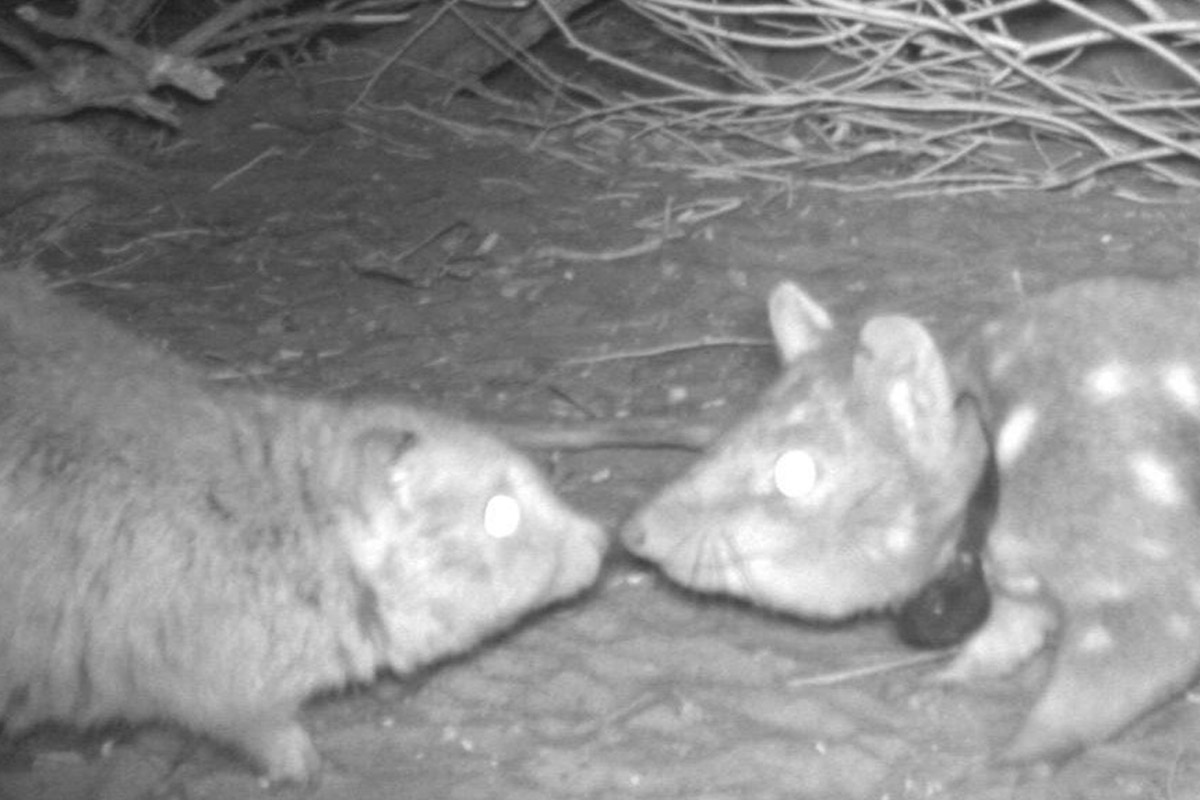 A naive burrowing bettong investigating a carnivorous western quoll.